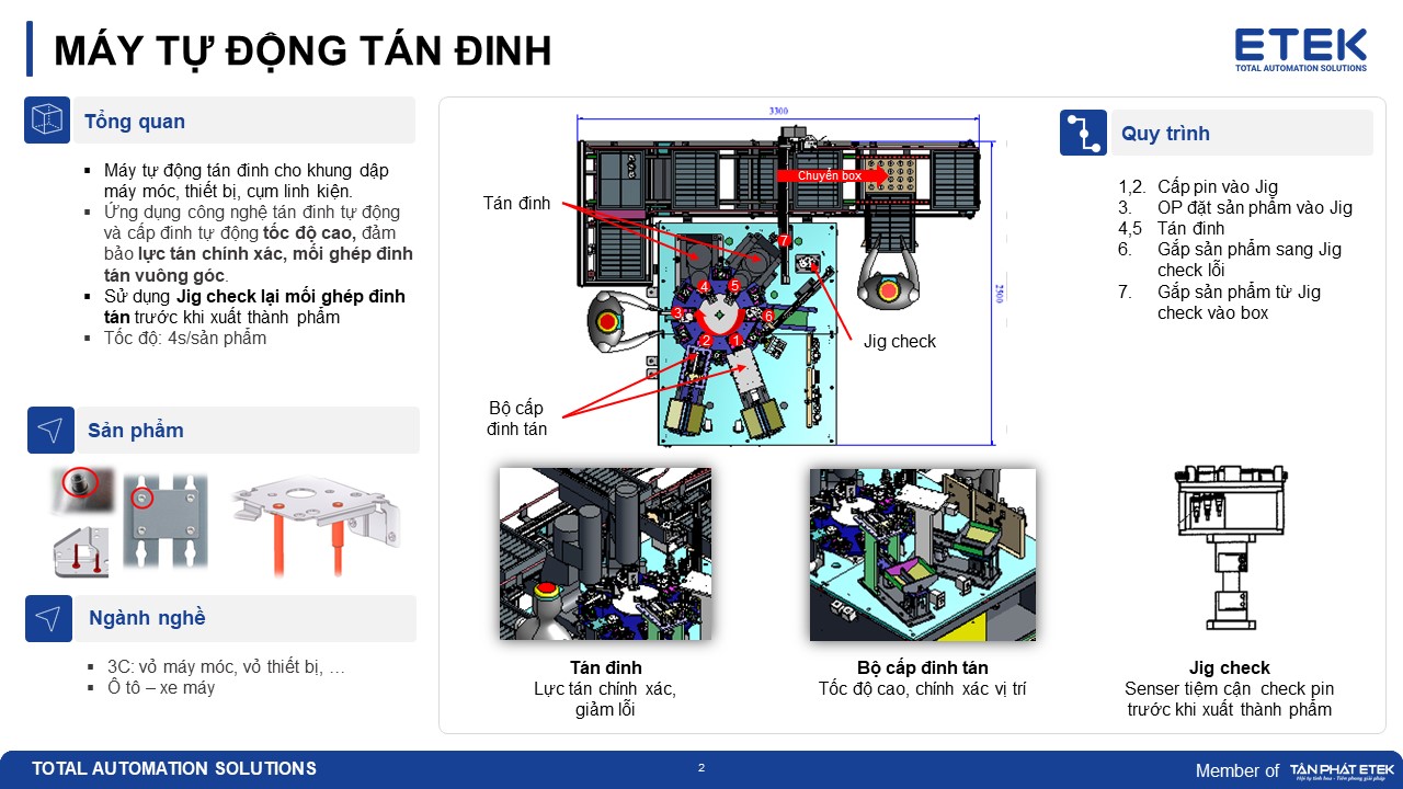Với kinh nghiệm nhiều năm triển khai các hệ thống máy tự động và dây chuyền tự động hóa cho ngành công nghiệp, ETEK mang đến giải pháp máy tán đinh tự động thiết kế theo yêu cầu, đáp ứng đồng thời tốc độ – độ chính xác – độ tin cậy – khả năng mở rộng cho doanh nghiệp sản xuất.